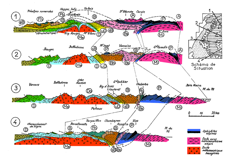 Ces quatre coupes cherchent surtout à montrer les rapports géométriques entre les ensembles rocheux représentés sur la carte structurale, sans décrire les détails de leurs déformations. A l'examen de ces coupes on notera essentiellement les caractères suivants, qui sont des traits fondamentaux de la structure tectonique des Alpes :