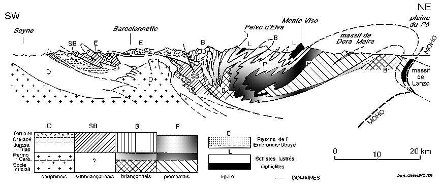 P --- Domaine liguro-piémontais (on a représenté les ophiolites en noir).