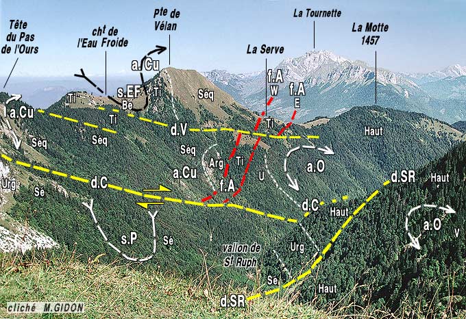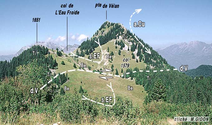 a.Cu = anticlinal du Curtillet ; s.EF = synclinal de l'Eau Froide ; d.V = décrochement du Vélan.
