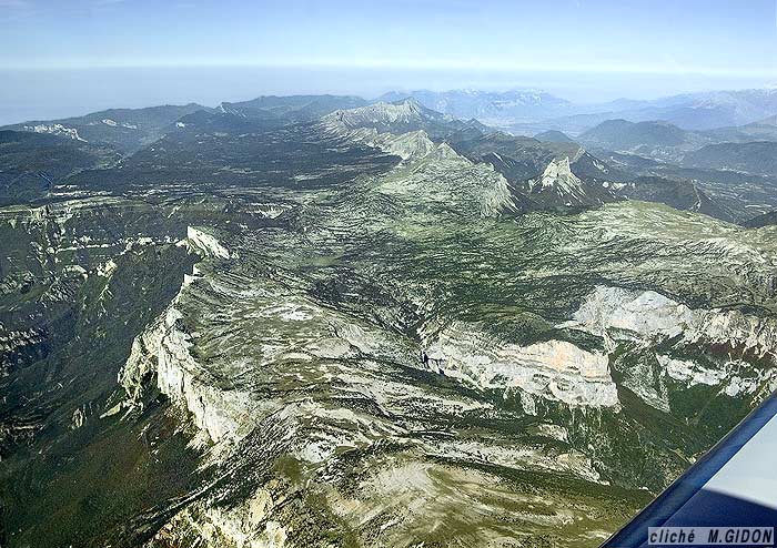 Le Vercors, vu d'enfilade du sud, d'avion, depuis l'aplomb de Châtillon en Diois (la partie sud-occidentale du massif est toutefois hors du champ du cliché, à gauche)
