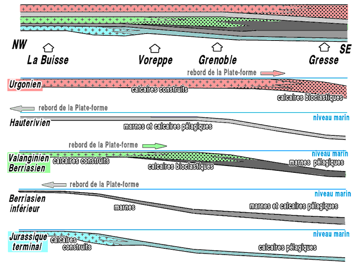 Coupes très schématiques Le schéma supérieur montre l'organisation finale des faciès (figurés noirs). Le glissement des zones de faciès est essentiellement dû aux alternances de progradation* de la plate-forme jurassienne vers le SE (flèches de couleur) et de rétrogradation (flèches grises). Ces dernières sont en général dues à une remontée rapide du niveau marin, ce qui "noie" la plate-forme. N.B. : le terme "calcaires construits" désigne tous les faciès de la plateforme, y compris ceux de son rebord (parfois récifal). |