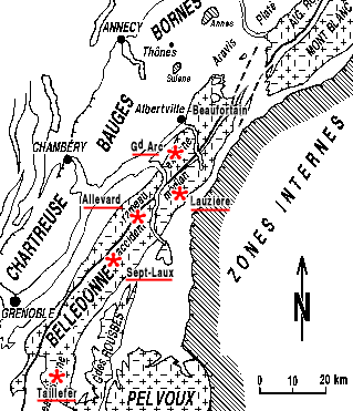 Toutefois, au nord d'Albertville, les coupes sismiques continues ("profil ECORS") montrent au contraire un raccord progressif, par une inflexion continue, de l'interface socle-couverture, entre le Beaufortain (prolongement nord de Belledonne) et le soubassement des Bauges (prolongement nord de la Chartreuse), ce qui ne confirme guère cette hypothèse.