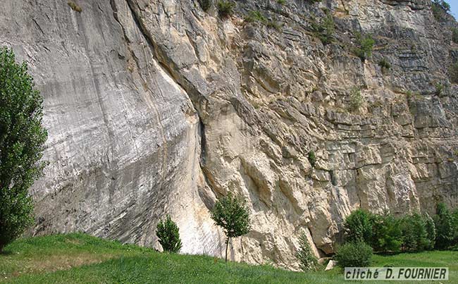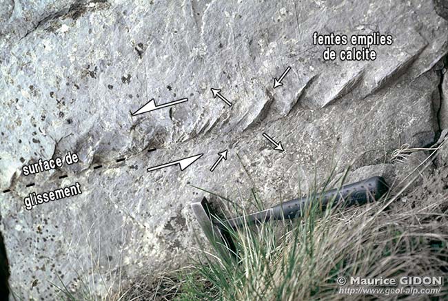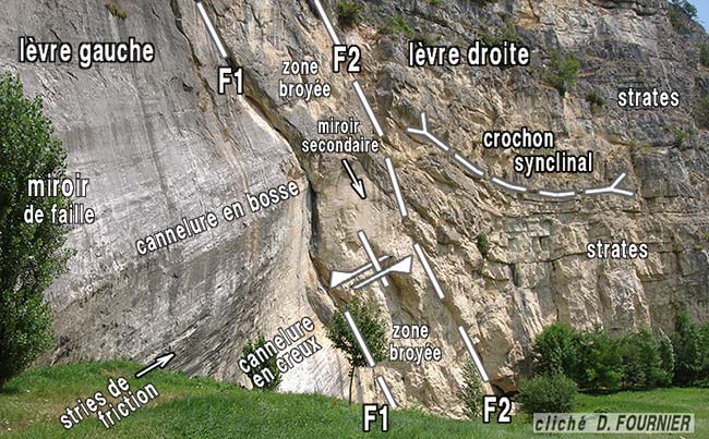 Le miroir de faille de La Petite Balme, près de Sillingy (74), vu de l'ouest : la lévre gauche correspond au compartiment septentrional. Cette faille, orientée presque W-E, tranche ici l'extrémité méridionale de la montagne de Mandallaz (elle-même prolongement méridional du Salève). Le contexte régional indique un rejet sénestre (les demi-flèches indiquent le sens du mouvement relatif des lèvres) qui est confirmé les stries et cannelures de son miroir. Cette faille se rattache à l'important faisceau de cassures sénestres, dénommé "faille du Vuache", qui se poursuit vers l'Est jusqu'au delà d'Annecy. Elle n'en représente toutefois qu'une faille secondaire "de Riedel" (le tracé de la faille principale, orienté NW-SE, est masqué par le talutage de pied de falaise, garni de végétation). |