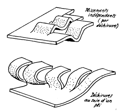 La formation des crochons est facilement associée à la rupture des flancs courts des plis de propagation ; elle se comprend aisément par le jeu du phénomène de "nucléation" des plis qui correspond à un blocage du glissement couches sur couches dans une pile de strates soumise à un cisaillement parallèle aux strates.