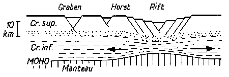Ces fossés tectoniques, dus au découpage de la croûte par des failles normales parallèles entre elles et de même sens de rejet, appartiennent le plus souvent à des dispositifs extensifs dissymétriques liés à une expansion océanique.