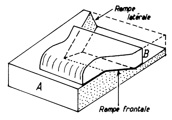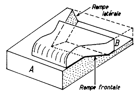 On peut en rapprocher les rampes latérales qui affectent certains chevauchements : ce sont des failles de coulissement de part et d'autre desquelles l'un des compartiments de la tranche chevauchante avance plus que l'autre, à la façon de deux tiroirs situés côte à côte dont on aurait tiré l'un plus en avant que l'autre. Par l'intermédiaire des rampes latérales le mouvement de chevauchement est transféré d'une ligne de chevauchement à une autre (en retrait ou plus avancée).