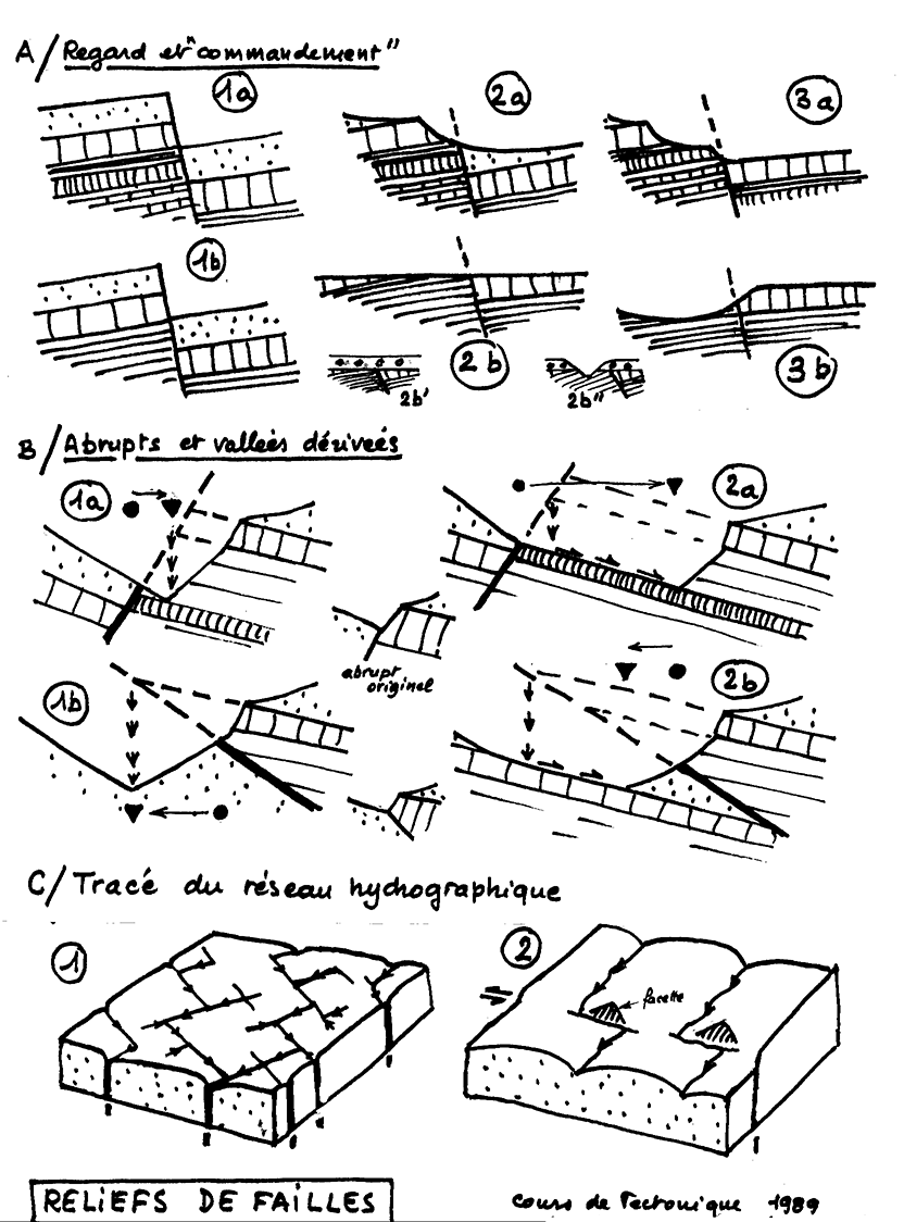 liste des articles de cette page (rangés par ordre alphabétique...) : Blocs basculés/Hémigrabens, branche de faille, cachetage, crochons, décrochements, failles de déchirure, rampes latérales, FAILLES, failles conjuguées, failles quaternaires (failles vivantes), failles secondaires de Riedel, Horst/Graben, rejet, reliefs de failles.