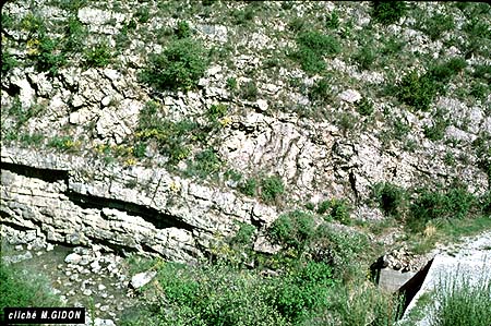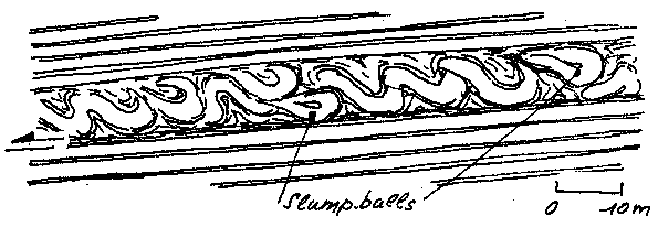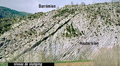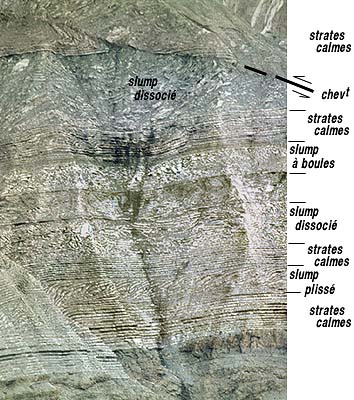 N.B. : En haut du cliché la succession est affectée par une faille dont la formation, beaucoup plus tardive, est totalement indépendante de celle des slumpings (cette faille détermine un joli crochon* qui témoigne de son jeu en chevauchement)
