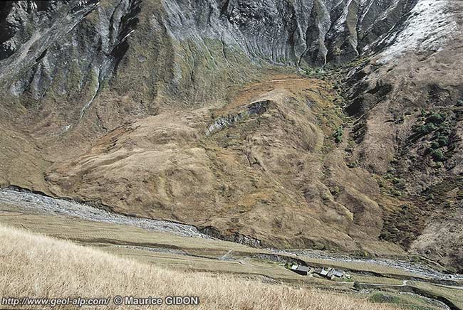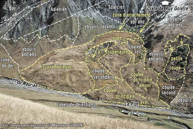 Splendide morphologie de loupes de glissement et de coulées boueuses formées aux dépens des calcschistes toarciens et de leurs éboulis : les figurés en jaune concernent le matériel glissé avec sa loupe principale et les coulées qu'elle a émise dès sa formation, ainsi que les coulées "secondaires", formées ultérieurement.