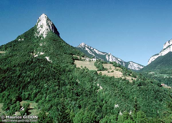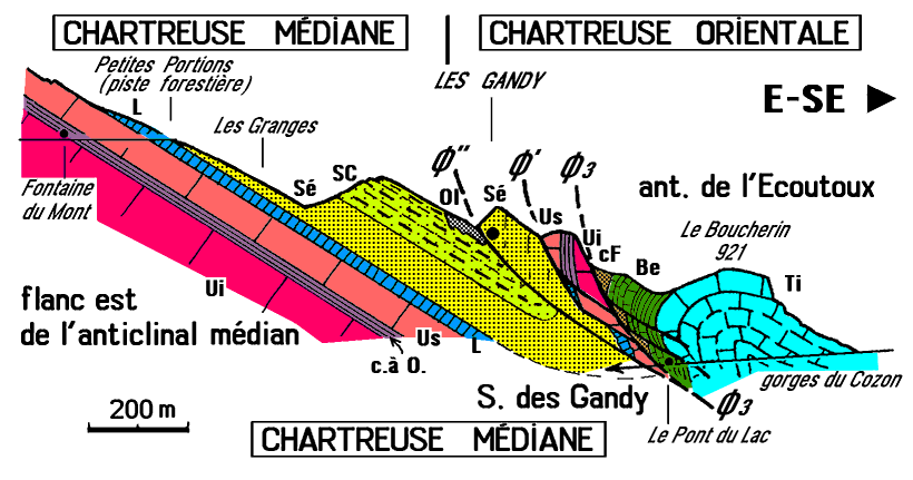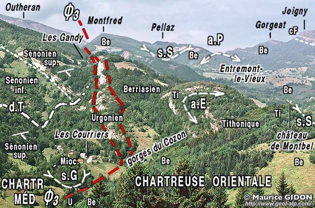 Les gorges du Cozon, au nord de Saint-Pierre-d'Entremont donnent un exemple assez schématique de cette géométrie. Ces gorges traversent le coeur, formé de Tithonique, du pli-faille frontal du chevauchement de la Chartreuse orientale (photo ci-après).