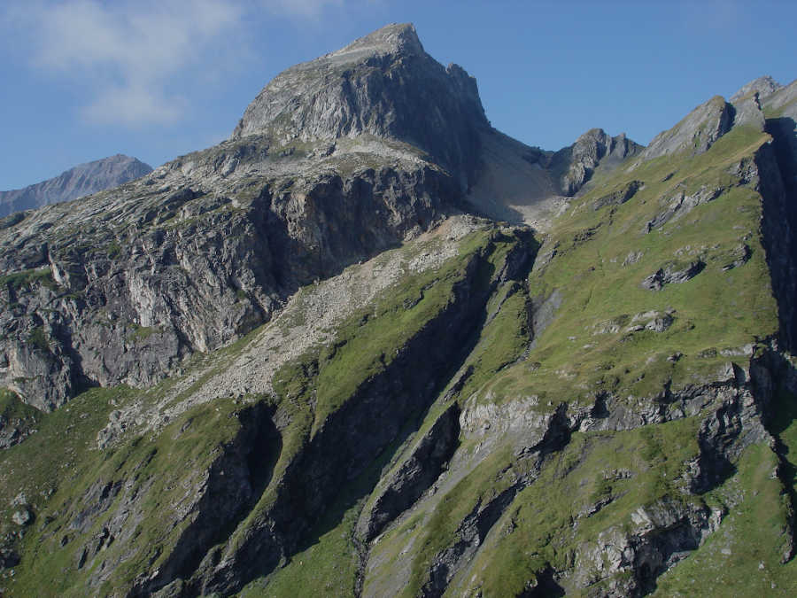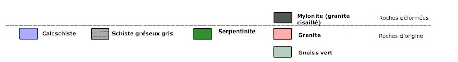 Grande écaille de granite permien (267 Ma) à pendage structural vers le sud-est, emballé dans le schiste gréseux gris, matrice du mélange tectonique de schistes à blocs. 2 blocs dans la pente, probablement de gneiss vert.