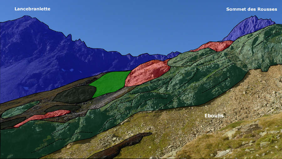 Imbrication d’écailles tout comme sur la crête de Pointe Rousse avec les mêmes lithologies. Ici le plan d’érosion est subparallèle au pendage des écailles vers le sud-est.