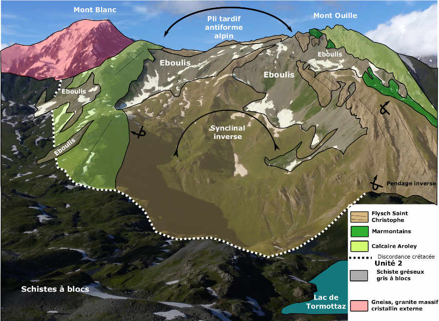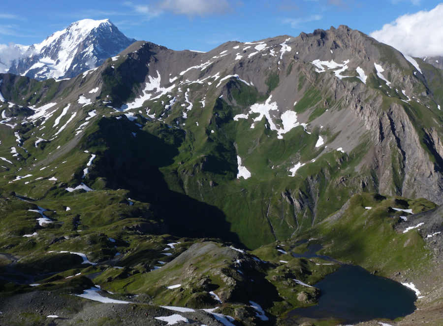 Au premier plan, tapis de schistes à blocs qui remontent depuis le Lac de Tormottaz jusqu’au vallon de Bassa Serra (droite de la photo). |