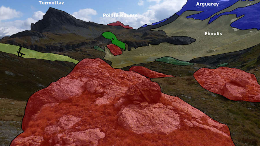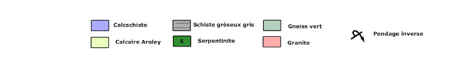 Falaise d’Aroley (base de la trilogie) en discordance sous sommet de Tormottaz (flanc inverse). Imbrication dans une matrice de schiste gréseux gris d’écailles tectoniques de granite clair type Pointe Rousse, de serpentinite et de gneiss vert. Contact de faille (localement avec cargneule) de ces schistes à blocs qui s’encastrent sous les calcschistes liasiques d’Arguerey, équivalents de l’Unité du Petit Saint Bernard.