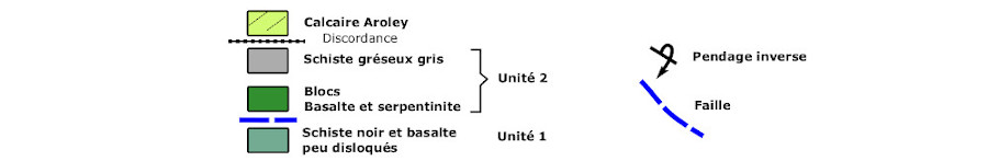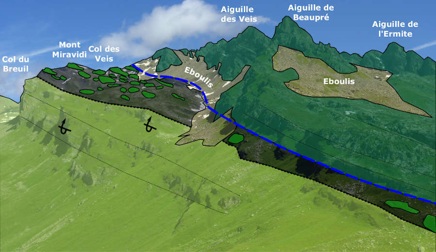 Cette coupe en série renversée montre la séquence volcano-sédimentaire peu déstructurée de basaltes océaniques intercalés avec des schistes noirs (Aiguilles de Beaupré, des Veys et de l’Ermite) base de la séquence océanique, en contact de faille (tiret bleu discontinu) assez franc avec une unité de schistes à blocs composé uniquement de basaltes océaniques et l’écaille de serpentinite sous le Mont Miravidi.