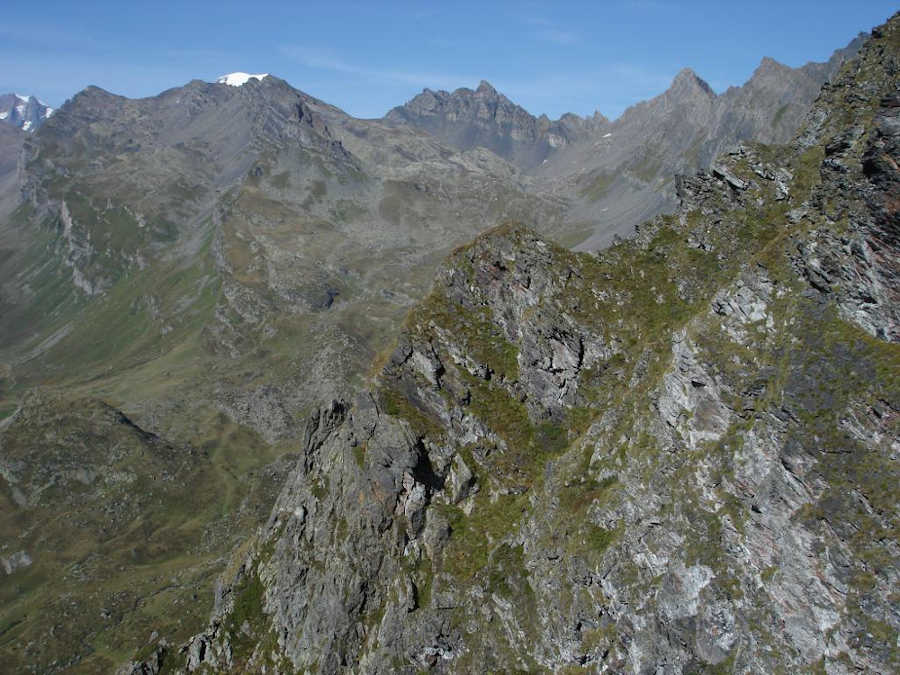 Vue M vers le nord depuis le nord du Clapet vers les sommets des roches océaniques valaisannes : Aiguilles de Beaupré, des Veys et de l’Ermite.