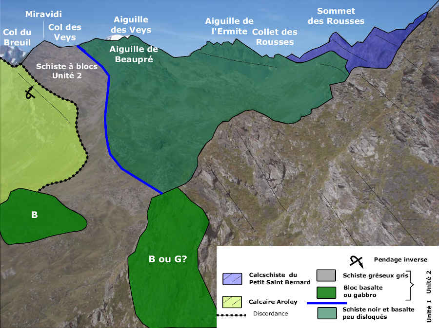 Au premier plan escarpement de schiste gréseux gris emballant l’écaille de gabbro du Clapet et en contre bas d’autres blocs de basalte océanique et/ou gabbro.