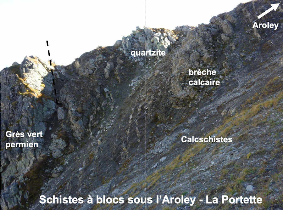 Reposant sur les grès vert massifs permien, et sous les conglomérats bréchiques calcaires de l’Aroley, on retrouve au sud de la Combe de la Neuva une unité de schistes à blocs (quartzite blanc et brèche calcaire dans une matrice de calcschistes) sous les sommets de la Pointe de la Portette et du Roc de la Charbonnière.