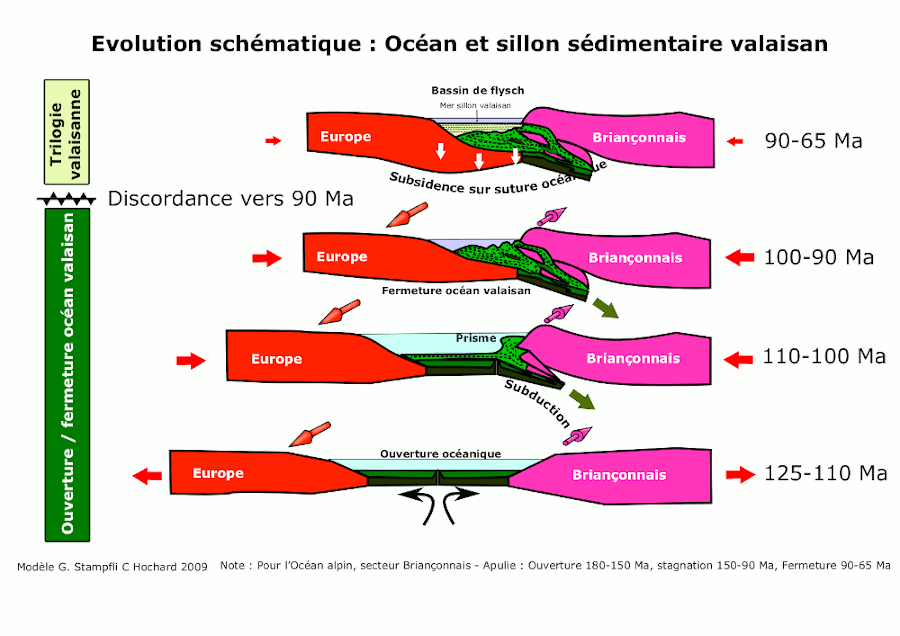 L’interprétation géodynamique du domaine valaisan s’appuie sur le modèle de G. Stampfli et C. Hochard de 2009. Il nous semble le plus adapté aux observations de terrain que nous présentons dans cette page.