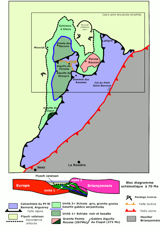 Les disccontinuités séparant ces unités (discordance, tiret noir en pointillé) et tectoniques (tiret bleu) se suivent bien cartographiquement. Elles sont recoupées nettement selon une direction NE-SW par des failles plus tardives, générées lors de la collision continentale alpine, mettant en contact les unités du prisme et du sillon valaisan avec les calcschistes du Petit Saint Bernard, eux-mêmes s’encastrant sous le Houiller briançonnais qui affleure dans la partie SE de la carte.