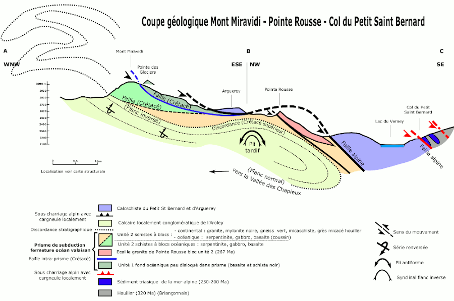 Ces dernières failles sont le témoin de la subduction continentale de ces unités avec enfouissement à 30 km de profondeur du Valaisan et Petit Saint Bernard, puis exhumation, il y a 40 - 25 Ma.