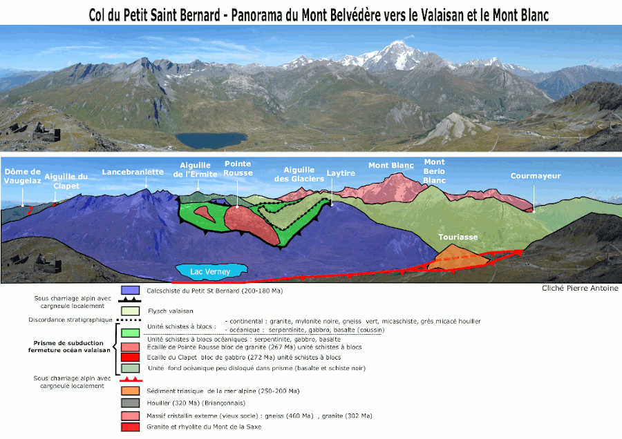 Ce panorama, pris depuis le Mont Belvédère (à l'est du Petit Saint-Bernard), offre une bonne vue de l’ensemble de la zone valaisanne interne dans un contexte alpin global avec les massifs cristallins dans le fond (massif du Mont-Blanc). Au premier plan, ce panorama montre bien que le Houiller briançonnais surmonte structuralement les calcschistes liasiques du Petit Saint Bernard, qui eux-mêmes surmonte structuralement les unités valaisannes (prisme et trilogie).