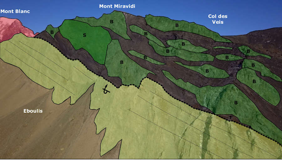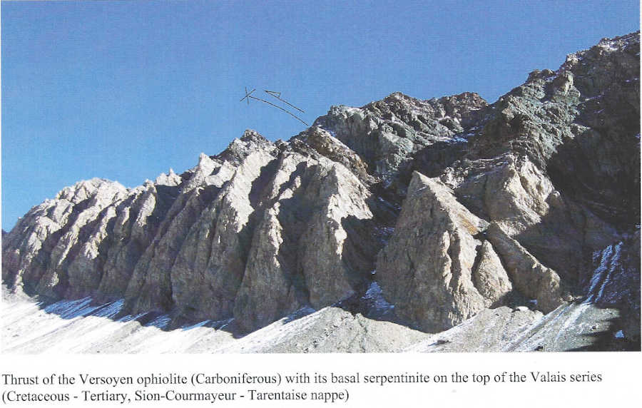 • Masson décrit un contact tectonique de nappe (avec une importante discontinuité métamorphique) pour le Versoyen sous la serpentinite du Miravidi (voir photo ci-dessous), surmontant un wildflysch (le Wildflysch de la Méchandeur) déposé par-dessus l’Aroley, qu’il considère comme le sommet de la trilogie valaisanne (succession en série normale donc pour lui dans ce secteur du col du Breuil, avec le Flysch St Christophe à la base de la trilogie et Aroley au sommet).