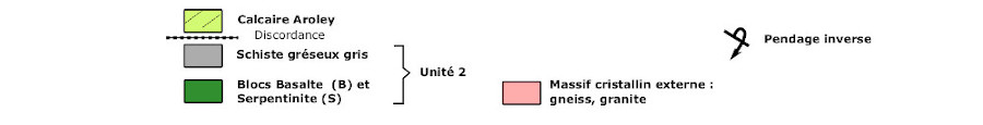 • Masson ne voit aucun lien entre le Versoyen et le bassin sédimentaire valaisan. Pourtant la discordance de la base de l’Aroley avec la série volcano sédimentaire du Versoyen sous-jacente se suit parfaitement cartographiquement et aucune faille ne pourrait remplacer ce contact stratigraphique. En effet, partout dans ce secteur, nous pouvons observer la base de l’Aroley (en position renversée) posée de façon continue stratigraphiquement sur les schistes à blocs (Bassa Serra, Pointe Fornet, Mont Ouille, Tormottaz, falaise du Miravidi, etc.), sans possibilité de faille majeure à ce niveau. Car jamais nous n’observons l’Aroley faillé et impliqué au sein des schistes à blocs sous-jacents. • Serge Fudral note bien par ailleurs à la base de l’Aroley vers le col du Breuil (en position donc inverse), juste au-dessus de la discordance, un dépôt de mariposite (minéral chromifère), remaniement très probable de la serpentinite sous-jacente, confirmant bien ici une discordance stratigraphique.