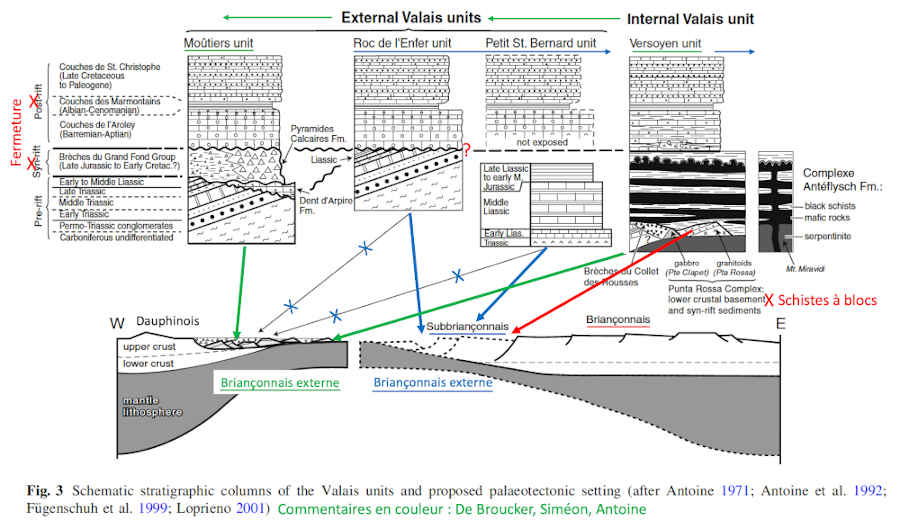 • Pour Loprieno, toutes les séquences se déposent en contexte d’extension. La trilogie valaisanne se dépose ainsi sur une transition continent-océan. Le granite de la Pointe Rousse est considéré comme un « extensional allochton ». L’auteur ouvre l’océan valaisan, mais à aucun moment il ne le referme, conservant dans son modèle une marge passive jusqu’au sommet de la trilogie (dépôts post-rifts). Il mentionne, pour le dépôt de l’Aroley, un environnement de « rift induced flank uplift »… Il passe donc de l’environnement rifting, en extension, directement à la collision alpine…