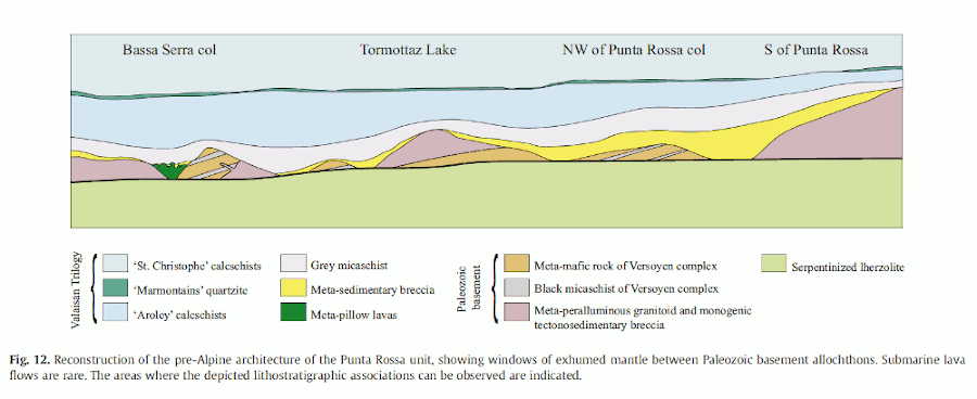 • Pour Beltrando, le secteur de Pointe Rousse représente un exemple préservé de rifting « hyper extended rift margin ». Contre des blocs de socle se détachant sur le manteau, il observe bon nombre de brèches sédimentaires monogéniques déposées pour lui au pied des failles normal lors du rifting. Beltrando interprète donc ce secteur en marge passive, tout en extension, scellée en discordance par la trilogie valaisanne (Fig. 12 ci-dessous).