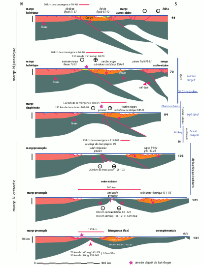 – Le dôme flexural s’éloigne vers le nord et le bassin étroit qui subsiste entre les deux continents reçoit des turbidites distales pendant cette période de très haut niveau de la mer (formation des Marmontains). Le Briançonnais se retrouve maintenant devant l’ancienne marge jurassique dauphinoise, marge nord de l’océan piémontais. Cette marge piémontaise se trouve donc maintenant dupliquée sur cette transversale.