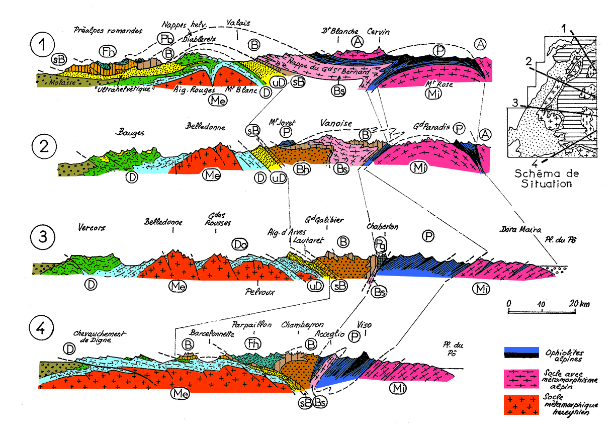 2 / Dans les zones internes (domaines briançonnais, piémontais et austro-alpins), la structure tectonique est dominée par le développement des "nappes de charriage". Celles-ci se sont déplacées grossièrement de l'Est vert l'Ouest. L'ampleur du transport de ces masses rocheuses est indiquée par les tiretés qui en raccordent les portions extrêmes à leurs zones de "racines" (notamment sur la coupe 1) : elle peut dépasser 100 km. Les principales surfaces de chevauchement de ces nappes (marquées par des traits plus gras), se montrent en outre courbées de façon variée, ce qui laisse présumer que des mouvements les ont déformé postérieurement à la mise en place des nappes. On constate en particulier que le domaine briançonnais a servi en quelque sorte de charnière dans ces mouvements tardifs, car c'est à son niveau qu'apparaît un reploiement avec basculement vers l'est des nappes empilées. Cette disposition qualifiée de "rétrocharriage" est cause de ce que le pendage général des assises (compte-tenu des ondulations de détail) est dirigé vers l'est entre massifs cristallins externes et briançonnais, tandis qu'il est incliné vers l'ouest entre Briançonnais et massifs cristallins internes.