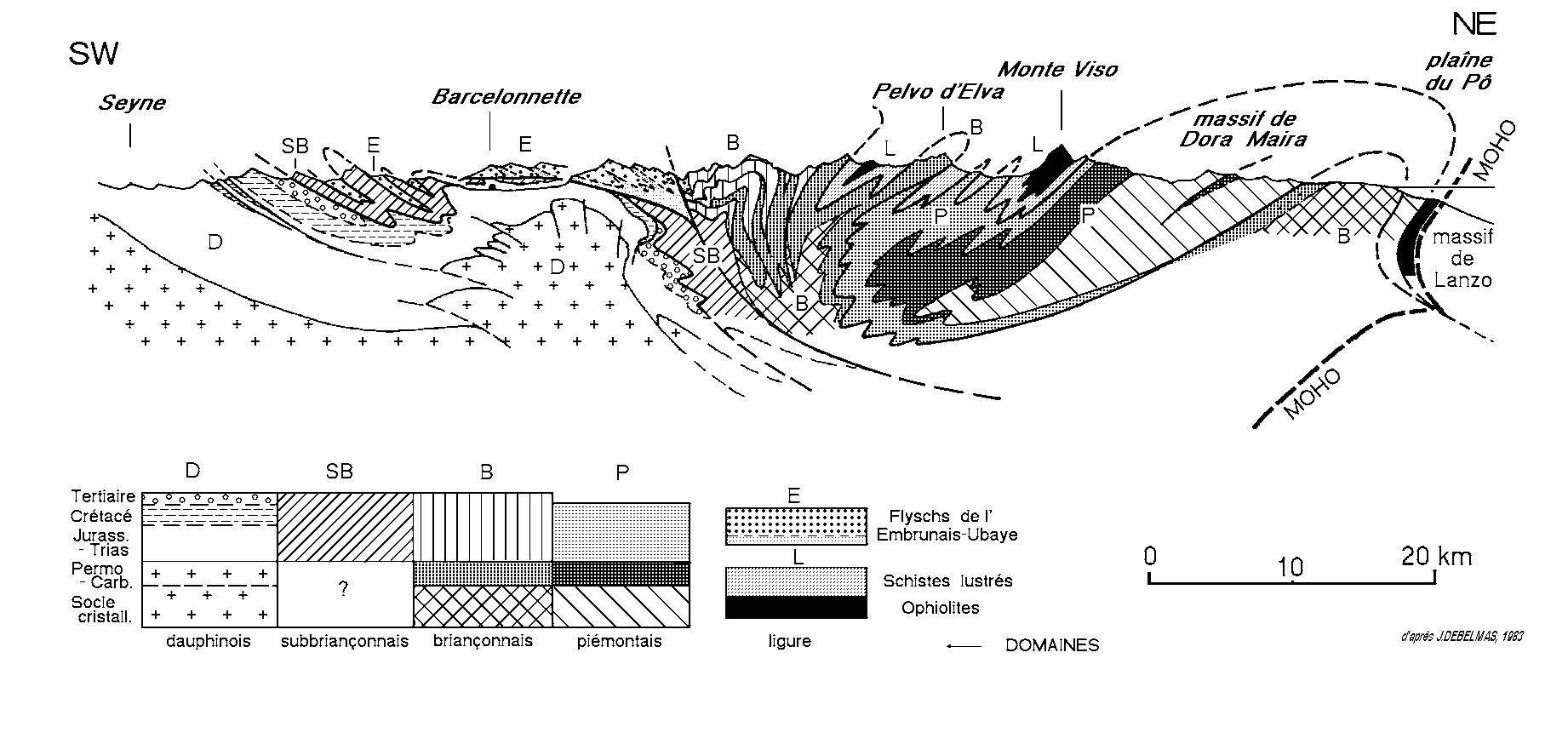 Jaune vif = Jurassique et Crétacé des chaînons du Jura ; Brun = Tertiaire (en prédominance = molasses) ; Rouge = massifs cristallins externes ; bleu pâle = Jurassique moyen- inférieur ; vert vif = Jurassique supérieur - Crétacé ; gris = Éocène-Oligocène (en prédominance : flyschs). Beige = zone valaisane ; Jaune d'or = Zone subbriançonnaise ; orangé = Zone briançonnaise sensu stricto ; rose pâle = Zone ultrabriançonnaise ; vert sombre = Zone piémontaise sensu stricto ; vert-kaki pâle = Zone liguro-piémontaise ; vert-kaki sombre = Zone des flyschs de l'Embrunais ; rose pâle = massifs cristallins internes. (extrait de la "Carte géologique simplifiée des Alpes occidentales, du Léman à Digne" [publication n° 074]) |