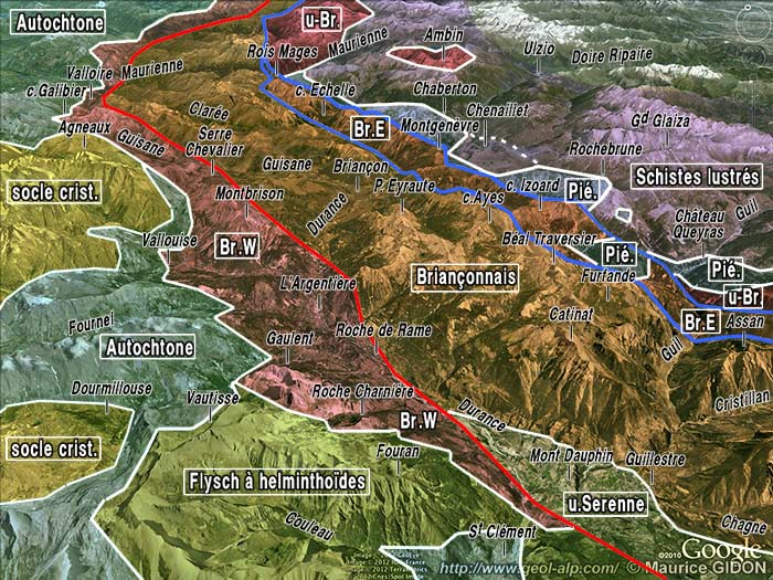 Schistes lustrés = domaines piémontais et ligure ; Pié. = frange de matériel piémontais ; Ultra-Br. = Ultra-briançonnais = zone d'Acceglio et