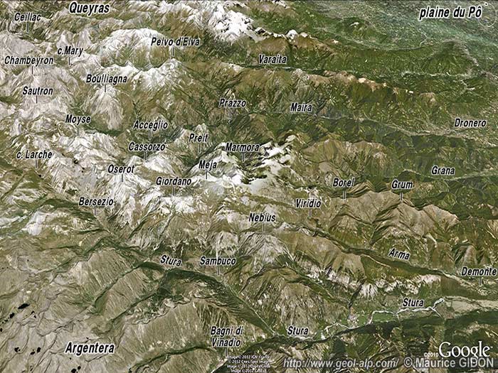 D'autre part l'on retrouve dans son prolongement sud-oriental, dans la vallée de la Stura une disposition comparable à celle du revers oriental du Pelvoux. En effet au col de Larche la limite nord-orientale des flysch de l'Embrunais correspond à une faille d'Argentera (qui tire son nom du village de ce nom).