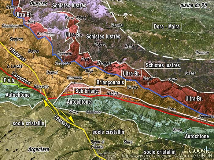 Au SE de Bersezio la vallée de la Stura s'inscrit dans le socle cristallin du revers oriental du massif de l'Argentera. Le rejet de la faille de Bersezio, bien qu'important, est limité à une simple décrochement dextre de rejet pluri kilométrique : il ne semble donc pas pouvoir faire de cet accident le prolongement du Front briançonnais. En fait ce dernier se décale vers l'est pour rejoindre la vallée de l'Arma puis traverser la vallée de la Sura à Demonte, en biseautant la bordure externe de l'imbrication des nappes briançonnaises inférieures et subbriançonnaises. Il y prend l'aspect d'une surface tectonique de plus en plus verticale vers le bas qui biseaute également le Nummulitique (grès d'Annot) de la couverture autochtone du socle. La structure de la zone briançonnaise se résout alors à un faicceau de failles, parallèles à l'allongement de la chaîne, entre lesquelles l'imbrication des panneaux rocheux correspondant aux nappes superposées est de moins en moins perceptible.