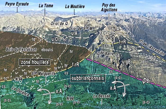 De haut en bas : u.A = unité des Aiguillons ; u.Or = unité des Oriols ; f.rR = faille de La Roche-de-Rame (prolongement septentrional probable de la faille de la Durance) ; u.gB = unité de la Grande Barre de l'Argentière et de La Roche-de-Rame ; ØBR = chevauchement basal des nappes briançonnaises ; a.A = anticlinal de la fenêtre de l'Argentière.