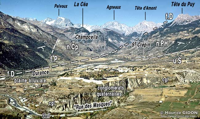 Toutefois il s'avère que la faille de la Durance se prolonge au sein des flyschs argileux de l'Unité de Serenne, au voisinage de sa limite avec les affleurements de la nappe du Parpaillon, par une grande dislocation sub-verticale dont on perd, vers le SE, le tracé précis vers la latitude de Vars (levés de Cl. Kerkhove pour la 2°édition de la feuille Embrun).