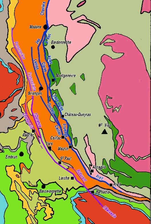 - au NE un empilement des nappe briançonnaises, qui s'imbriquent en plongeant les unes sous les autres en direction du NW et qui recouvrent en outre, en direction du SE à partir de Bersezio, des unités subbriançonnaises ;