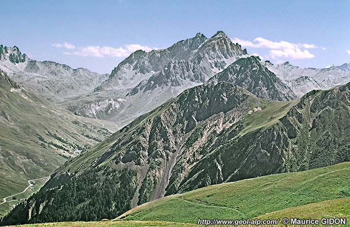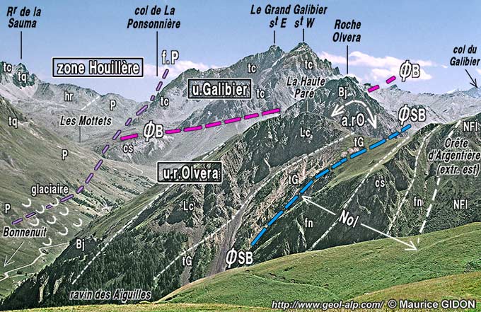 Noter la juxtaposition directe du houiller de la zone briançonnaise "axiale" et du matériel subbriançonnais de la fenêtre de l'Argentière (avant plan, en bas du cliché) et l'absence de houiller sous l'unité de la Grande Brèche.