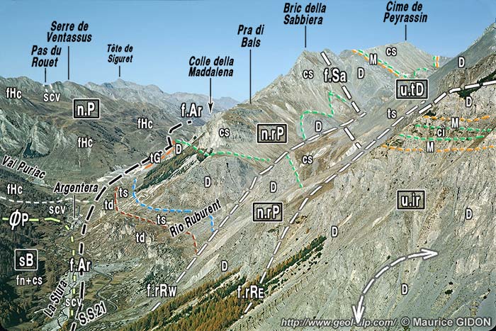 Cette faille d'Argentera se prolonge vers le nord, après un petit décalage dextre de son tracé au col de Larche par l'accident de Saint-Ours qui suit la rive droite de l'Ubayette et qui se prolonge au nord de la vallée de l'Ubaye par la faille du Paneyron. Cette cassure, représente donc un accident majeur mais n'est en fait qu'un jalon, de nouveau clairement observable, d'un Front briançonnais méridional, dont le tracé suit grossièrement, depuis la Durance jusqu'ici, la bande d'affleurements de l'unité de Serenne (voir les pages "Larche", "Saint-Paul" et "Risoul").