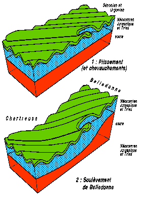 À la question des rapports avec la surrection de Belledonne fut donnée, dans les années 40, une réponse tellement séduisante qu'elle est, encore de nos jours, adoptée avec faveur par tous ceux qui en entendent parler pour la première fois. C'est celle d'une déformation des massifs subalpins dont le moteur aurait été le glissement gravitaire de la couverture : la formation du bombement, allongé NE-SW, de Belledonne aurait entraîné, au faîte de ce dernier, la déchirure de la couverture (par la traction de son propre poids) et celle-ci aurait glissé sur les flancs du chaînon cristallin en se froissant.