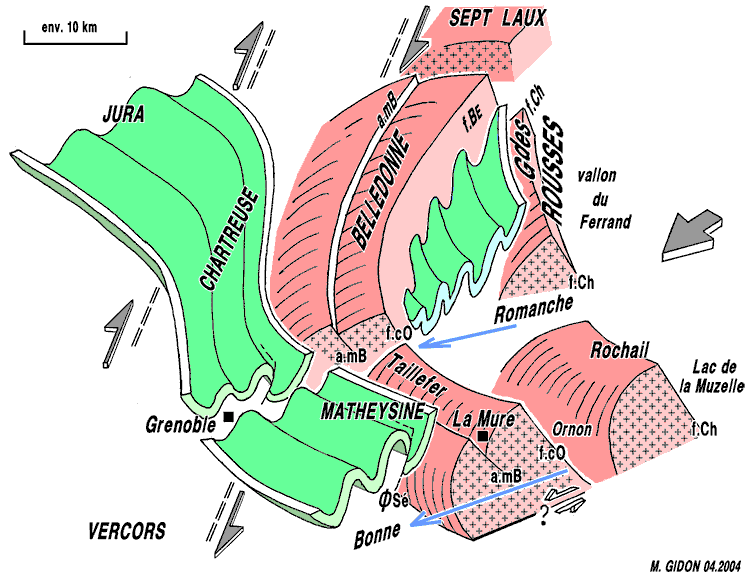 Un nouvel examen des structures orientales et occidentales des massifs subalpins septentrionaux s'impose donc, pour affiner l'interprétation de leur géométrie (en particulier de leurs inflexions longitudinales éventuelles) en tenant compte de ce nouveau contexte explicatif. L'analyse des environs de Grenoble, tant du côté Chartreuse que du côté Vercors, semble d'ores et déjà bénéficier de cet éclairage nouveau de plusieurs de ses structures (voir les pages "Quaix", "Néron", "Sassenage" et "Moucherotte") |