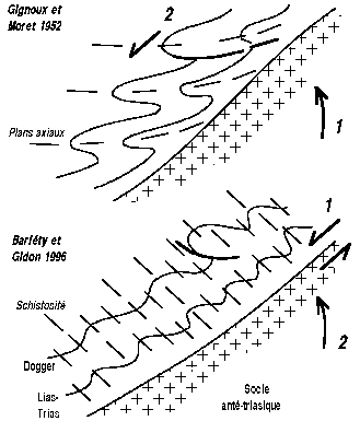 Ce dernier aspect, pourtant très peu étayé par les observations, s'est avéré important pour la compréhension du mécanisme de déformation. En effet il a reçu ces dernières années, dans le site "geol-alp", un éclairage nouveau par la prise en considération de l'évidence que les chaînes subalpines du nord étaient affectées par un grand synclinal d'ensemble, d'échelle déca-kilométrique, donc "régionale".
