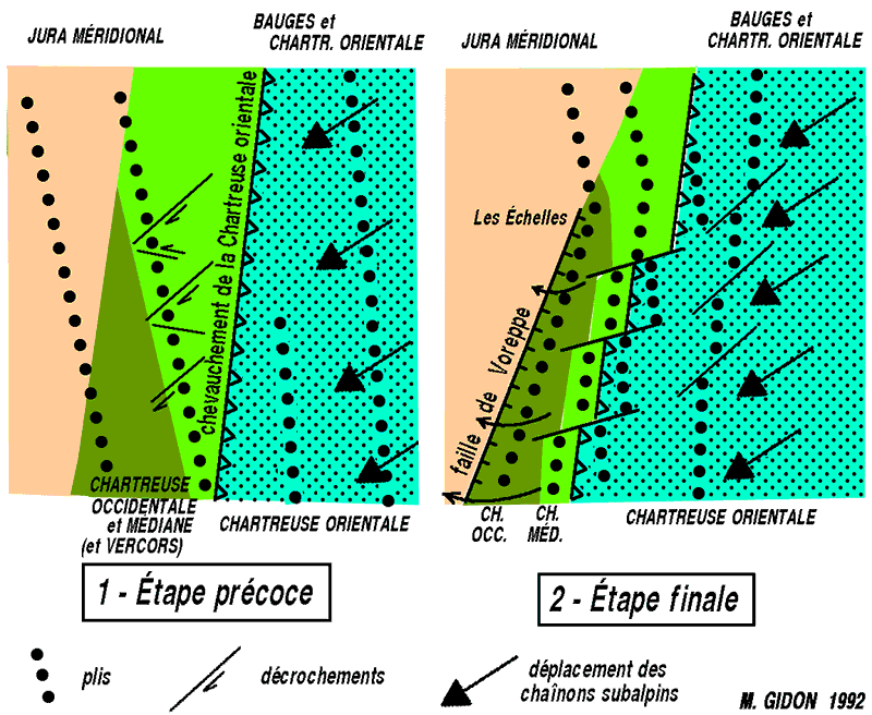 Cette interprétation est renforcée par l'évidence d'un pivotement dextre des axes de plis aux confins de la Chartreuse et du Vercors avec le Jura. En effet les plis de l'extrémité sud du massif du Jura, déjà apparus à l'Oligocène avec ceux de la Chartreuse W, ont été bousculés vers le SW, à la fin du Miocène, par l'avancée du chevauchement de la Chartreuse orientale. Cette déformation a en grande partie été permise par la formation de la faille de Voreppe, dont le rejet chevauchant s'accroît du nord vers le sud. Cette torsion des plis du Jura de la Chartreuse W a sans doute conduit le mouvement le long du chevauchement de la Chartreuse orientale à acquérir une composante de coulissement vers le S, composante qui est absorbée en partie par le jeu dextre des décrochements qui affectent la Chartreuse orientale.