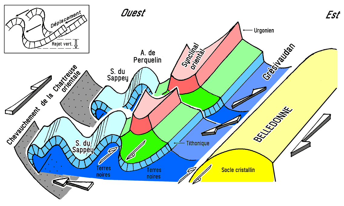 Ce pivotement des plis, aux confins du Jura et de la Chartreuse doit sans doute être attribué à ce que leurs extrémités sud-orientales se sont trouvés soumises à un coulissement dextre vers le sud, alors qu'ils étaient, plus à l'ouest, bloqués sous la chape, de plusieurs milliers de mètres d'épaisseur, des molasses du sillon périalpin, dans laquelle ils avaient été ennoyés durant le Miocène.