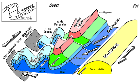 Schéma cartographique montrant les déformations qui sont intervenues dans les chaînons plus occidentaux du massif et dans ceux de l'extrémité méridionale du Jura, du fait de l'avancée du chevauchement de la Chartreuse orientale : torsion des plis et décrochements "accomodent" le déplacement "en crabe" (avec coulissement vers le sud-ouest) de la Chartreuse orientale. Au sujet des plis du Jura voir aussi la page |