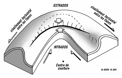 Il est remarquable que la torsion des plis s'accompagne de la rupture de leur voûte par une faille longitudinale qui joue en chevauchement. Ceci s'explique aisément si l'on prend en compte le fait que, lors de la torsion, les deux flancs du pli ne peuvent que conserver leur longueur**, bien qu'il soient soumis à des efforts longitudinaux différents : le flanc situé à l'intrados (ici du côté occidental) devrait se raccourcir par rapport à celui à l'extrados de la portion tordue, qui au contraire devrait s'allonger.