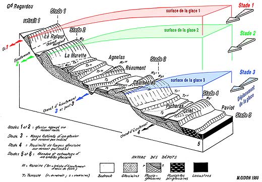C'est ainsi qu'une surface notée 2R (c'est à dire due à une érosion fluviatile au cours du retrait de l'intervalle interstadiaire 2), peut parfaitement affecter des alluvions glaciaires du stade 1, ou du bedrock miocène, qui seraient éventuellement accessibles en tranchée ou forage à seulement 1 ou 2 m de profondeur, sous un mince masque de dépôts fluviatiles 2 (par exemple l'ancienne carrière située à l'ouest des Brosses d'Apprieu permet d'observer du matériel morainique 1 sous une couche fluviatile 2R ; le même matériel se voit, sous du fluviatile 3R, au tournant de la D50, à l'est du Rivier, là où s'embranche la route montant à Apprieu).