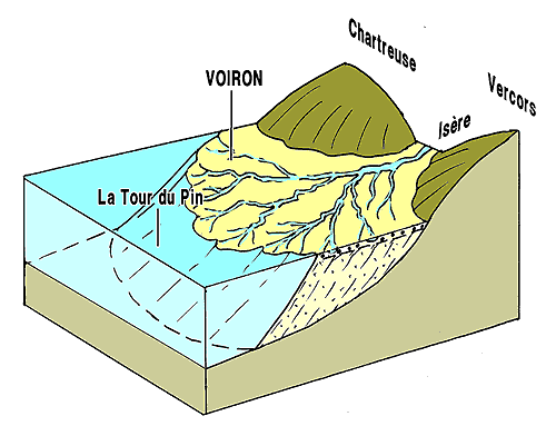 La section avant, orientée W-E (perpendiculairement aux chaînons subalpins), montre très grossièrement la disposition des strates, avec des couches de progression ("front beds") inclinées vers le large et des couches du sommet de colmatage ("top beds") horizontales. Les bras "distributaires" ont été représentés tous de la même manière à la surface du delta, mais, à un moment donné, seuls certains sont actifs tandis que d'autres sont morts car colmatés par une crue antérieure. N.B. : En fait le schéma montre la disposition correspondant à un seul épisode sédimentaire, Mais, dans un secteur donné, cette disposition se répète à intervalles de temps espacés, car, périodiquement, les apports sédimentaires s'interrompent (lorsque les trajets des chenaux distributaires abandonnent ce secteur) ; lorsqu'ils reprennent la subsidence a alors provoqué un enfoncement plus ou moins important de la surface des dépôts antérieurs, de sorte que les distributaires sont amenés à "reconquérir le terrain" en déposant de nouveau des strates de progression ("front beds") inclinées. |